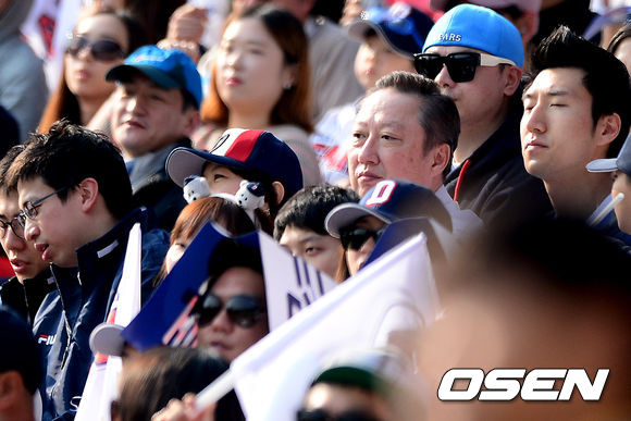 27일 오후 서울 잠실구장에서 열린 '2013 한국야쿠르트 세븐 프로야구' 한국시리즈 3차전 두산 베어스와 삼성 라이온즈의 경기, 박용만 두산그룹 회장이 팬과 함께 경기를 관전하고 있다.