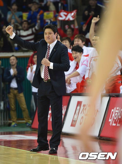 2쿼터, SK 문경은 감독이 선수들의 플레이를 지켜보며 환호하고 있다.