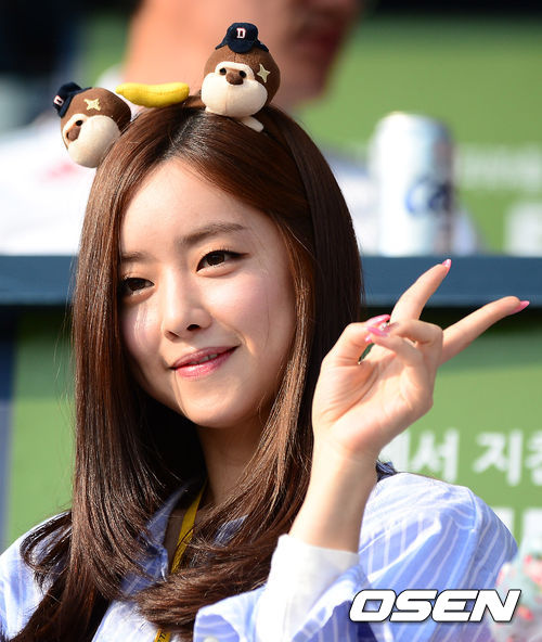 27일 오후 서울 잠실구장에서 열린 '2013 한국야쿠르트 세븐 프로야구' 한국시리즈 3차전 두산 베어스와 삼성 라이온즈의 경기, 배우 홍수아가 야구장을 찾아 경기를 관전하고 있다.