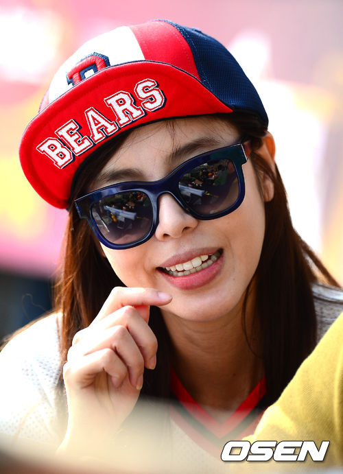 27일 오후 서울 잠실구장에서 열린 '2013 한국야쿠르트 세븐 프로야구' 한국시리즈 3차전 두산 베어스와 삼성 라이온즈의 경기, 배우 김규리가 야구장을 찾아 경기를 관전하고 있다.