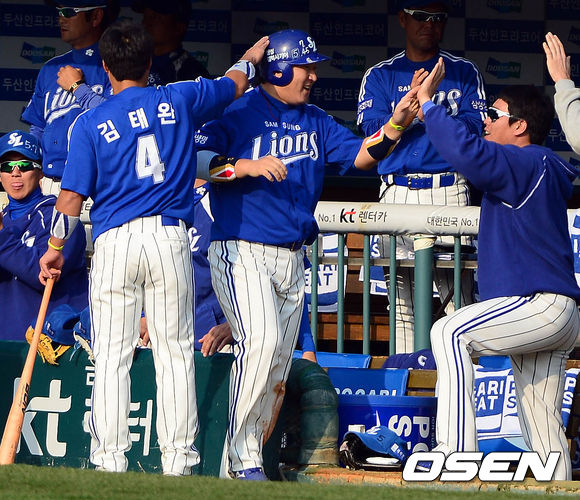 27일 오후 서울 잠실구장에서 열린 '2013 한국야쿠르트 세븐 프로야구' 한국시리즈 3차전 두산 베어스와 삼성 라이온즈의 경기 4회초 1사 만루 이지영의 희생플라이에 홈을 밟은 최형우가 덕아웃에서 동료들과 하이파이브를 하고 있다.