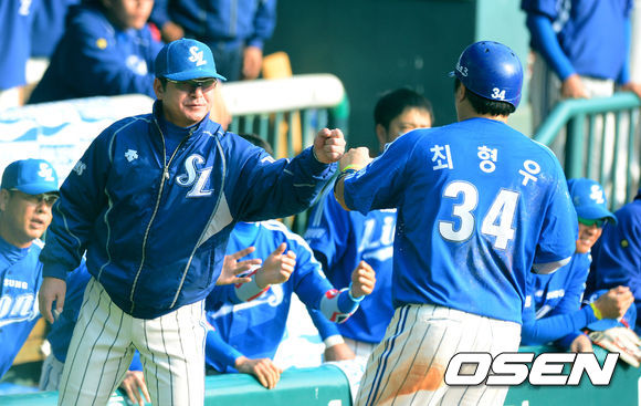 27일 오후 서울 잠실구장에서 열린 '2013 한국야쿠르트 세븐 프로야구' 한국시리즈 3차전 두산 베어스와 삼성 라이온즈의 경기, 4회초 1사 만루에서 삼성 3루주자 최형우가 이지영의 좌익수 플라이에 태그업, 홈에서 세이프되며 더그아웃에서 류중일 감독과 기뻐하고 있다.