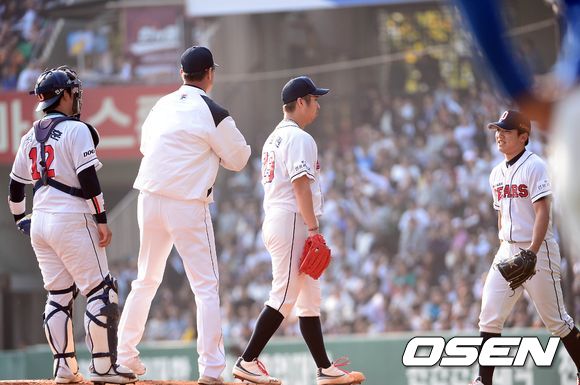 27일 오후 서울 잠실구장에서 열리는 '2013 한국야쿠르트 세븐 프로야구' 한국시리즈 3차전 두산 베어스와 삼성 라이온즈의 경기 4회초 1사 만루 이지영의 플라이때 3루주자 최형우가 홈에서 세이프 선언되자 이에 항의하는 유희관을 강성우 코치가 진정하라며 마운드에 오른것이 화근이 돼 유희관이 교체됐다. 코치가 한 이닝에 두 번 마운드에 오르면 투수교체로 인정된다. 이에 유희관이 마운드를 떠낙 있다.