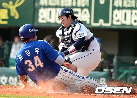 27일 오후 서울 잠실구장에서 열리는 '2013 한국야쿠르트 세븐 프로야구' 한국시리즈 3차전 두산 베어스와 삼성 라이온즈의 경기 4회초 1사 만루 이지영의 플라이때 3루주자 최형우가 홈에서 세이프 되고 있다.
