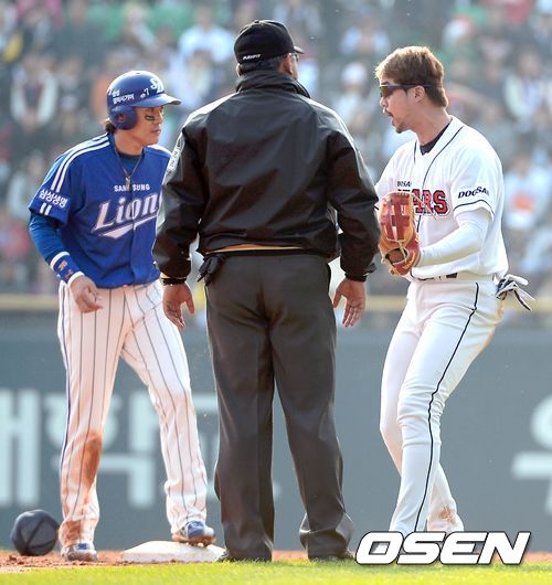 27일 오후 서울 잠실구장에서 열리는 '2013 한국야쿠르트 세븐 프로야구' 한국시리즈 3차전 두산 베어스와 삼성 라이온즈의 경기 4회초 1사 만루 박한이의 유격수 땅볼, 손시헌이 한 번 더듬고 급하게 던진 볼을 오재원이 놓친후 잡아 태그를 했지만 김풍기 2루심이 세이프를 선언하자 강하게 어필하고 있다.