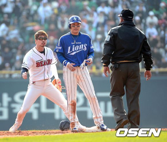 27일 오후 서울 잠실구장에서 열리는 '2013 한국야쿠르트 세븐 프로야구' 한국시리즈 3차전 두산 베어스와 삼성 라이온즈의 경기 4회초 1사 만루 박한이의 유격수 땅볼, 손시헌이 한 번 더듬고 급하게 던진 볼을 오재원이 놓친후 잡아 태그를 했지만 김풍기 2루심이 세이프를 선언하자 강하게 어필하고 있다.