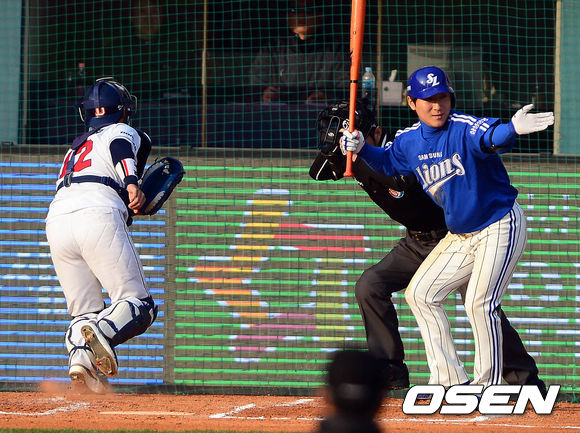 27일 오후 서울 잠실구장에서 열린 '2013 한국야쿠르트 세븐 프로야구' 한국시리즈 3차전 두산 베어스와 삼성 라이온즈의 경기 7회초 2사 3루 배영섭 타석, 홍상삼의 폭투에 배영섭이 3루주자 박한이에게 뛰라는 사인을 보내고 있다.