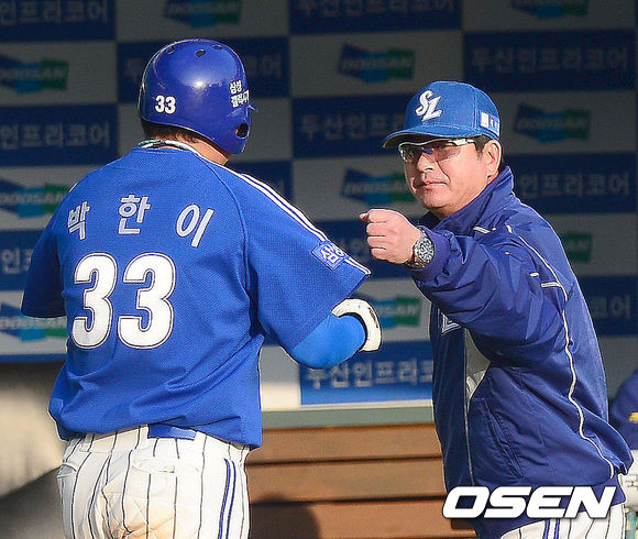 27일 오후 서울 잠실구장에서 열리는 '2013 한국야쿠르트 세븐 프로야구' 한국시리즈 3차전 두산 베어스와 삼성 라이온즈의 경기, 7회초2사 3루 두산 홍상삼 투수의 와일드 피칭때 3루주자 박한이 득점을 올리며 류중일 감독의 환영을 받고 있다.