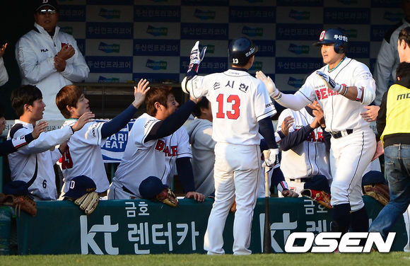 27일 오후 서울 잠실구장에서 열린 '2013 한국야쿠르트 세븐 프로야구' 한국시리즈 3차전 두산 베어스와 삼성 라이온즈의 경기 7회말 1사 홍성흔이 솔로홈런을 치고 덕아웃에서 동료들과 하이파이브를 하고 있다.