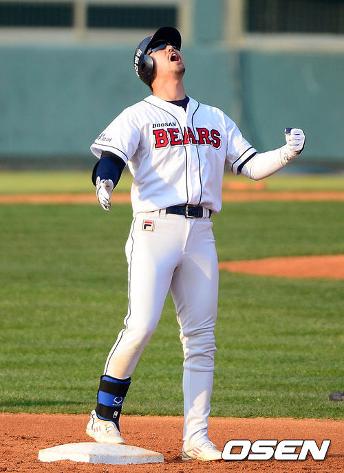 27일 오후 서울 잠실구장에서 열린 '2013 한국야쿠르트 세븐 프로야구' 한국시리즈 3차전 두산 베어스와 삼성 라이온즈의 경기 7회말 1사 오재원이 우익수 오른쪽 2루타를 치고 환호하고 있다.