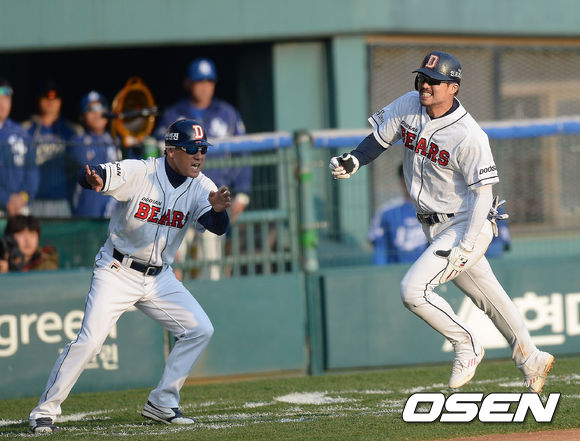 27일 오후 서울 잠실구장에서 열리는 '2013 한국야쿠르트 세븐 프로야구' 한국시리즈 3차전 두산 베어스와 삼성 라이온즈의 경기, 7회말 1사 2루 손시헌의 적시타때 2루 주자 오재원 왼쪽 어벅지 통증을 이기며 득점을 하고 있다.