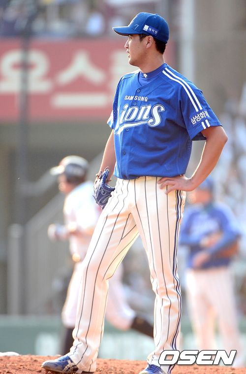 27일 오후 서울 잠실구장에서 열리는 '2013 한국야쿠르트 세븐 프로야구' 한국시리즈 3차전 두산 베어스와 삼성 라이온즈의 경기 7회말 1사 홍성흔이 자신의 파울타구에 맞은 부상에도 불구 추격의 솔로 홈런을 치자 장원삼이 이를 바라보고 있다.