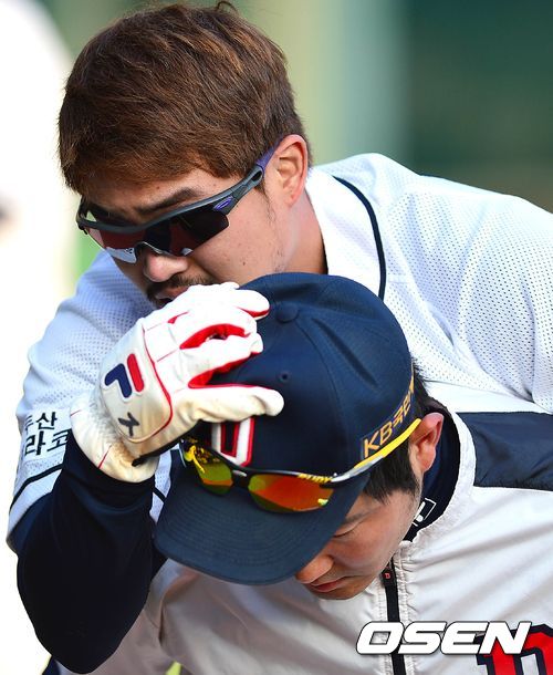 27일 오후 서울 잠실구장에서 열린 '2013 한국야쿠르트 세븐 프로야구' 한국시리즈 3차전 두산 베어스와 삼성 라이온즈의 경기, 7회말 두산 공격 1사 2루 손시헌의 적시 1타점 우전 적시타 때 홈을 밟은 오재원이 고통스러워하며 팀관계자에게 업혀 그라운드를 나서고 있다.