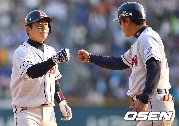 27일 오후 서울 잠실구장에서 열린 '2013 한국야쿠르트 세븐 프로야구' 한국시리즈 3차전 두산 베어스와 삼성 라이온즈의 경기, 7회말 두산 공격 1사 2루 손시헌이 적시 1타점을 날리고 김민재 코치와 인사를 나누고 있다.