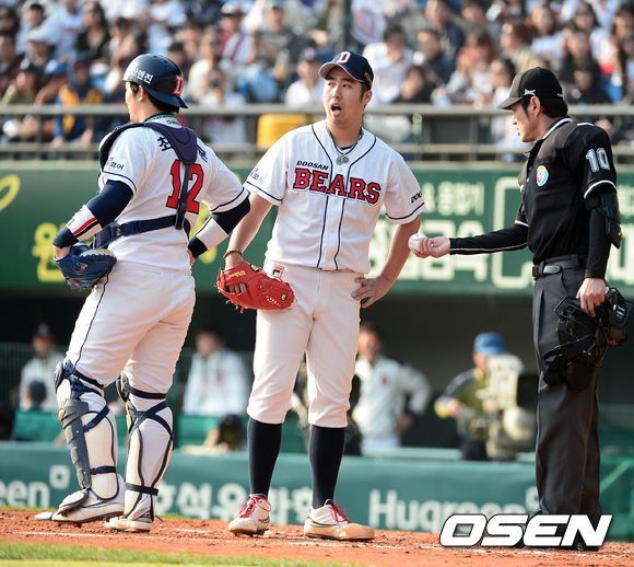 사고에 가까운 일이었다. 두산은 4회초 유희관이 첫 타자 박석민에게 2루타를 맞자 정명원 투수코치가 마운드에 올라 유희관을 진정시켰다. 문제는 그 다음이었다. 1사 만루에서 이지영의 좌익수 희생플라이 때 김진욱 감독이 구심을 향해 블로킹 여부를 놓고 항의했다. 이어 강성우 배터리 코치가 포수 최재훈을 진정시키기 위해 파울 라인을 넘어 페어 지역으로 들어왔고, 마운드 근처로 향하고 말았다. 이에 기록원과 심판진에서 마운드행 제한을 어긴 것으로 간주하며 유희관의 교체를 룰대로 적용했다. 두산은 부랴부랴 변진수로 투수를 교체했다.