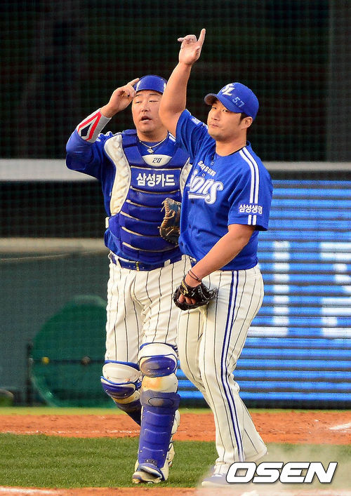 27일 오후 서울 잠실구장에서 열린 '2013 한국야쿠르트 세븐 프로야구' 한국시리즈 3차전 두산 베어스와 삼성 라이온즈의 경기 종료 후 진갑용과 오승환이 세레모니를 하고 있다.