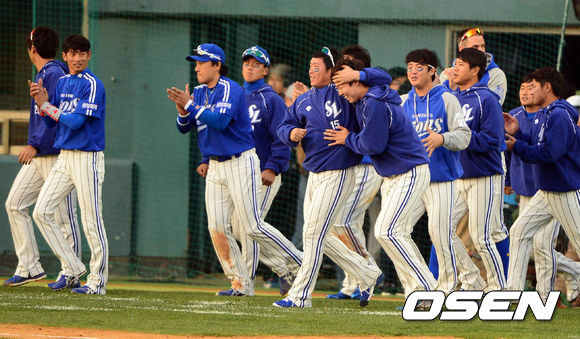 27일 오후 서울 잠실구장에서 열린 '2013 한국야쿠르트 세븐 프로야구' 한국시리즈 3차전 두산 베어스와 삼성 라이온즈의 경기 종료 후 삼성 선수들이 승리를 기뻐하고 있다.