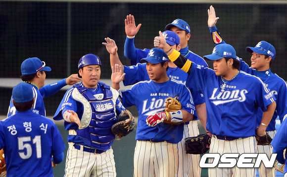 27일 오후 서울 잠실구장에서 열린 '2013 한국야쿠르트 세븐 프로야구' 한국시리즈 3차전 두산 베어스와 삼성 라이온즈의 경기 종료 후 삼성 선수들이 승리를 기뻐하고 있다.