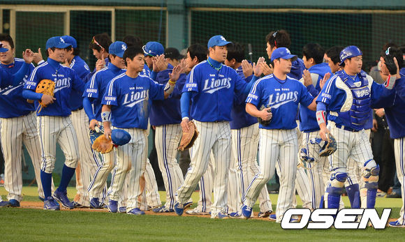 27일 오후 서울 잠실구장에서 열린 '2013 한국야쿠르트 세븐 프로야구' 한국시리즈 3차전 두산 베어스와 삼성 라이온즈의 경기 종료 후 삼성 선수들이 하이파이브를 하고 있다.