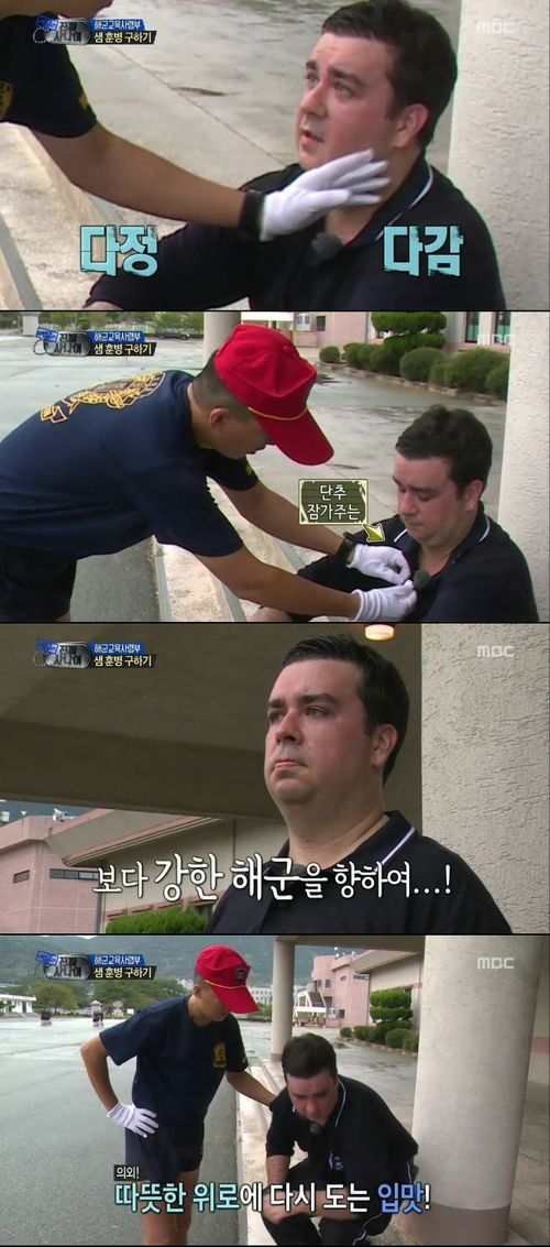 식사시간, 훈련소 앞에 앉아 땀을 흘리던 샘 해밍턴은 "굉장히 괴롭다. 멘붕이 왔다. 다 포기하고 싶다"며 힘든 마음을 드러냈다. 그러나 그에게 선임 소대장이 다가와 "혈압이 많이 높느냐. 운동을 많이 해야 혈압도 낮아진다"라고 격려했다. 또 샘 해밍턴의 단추를 잠가주는가 하며 땀을 닦아주고 어깨를 토닥여 주는 등 다정하게 돌보는 모습을 보였다.