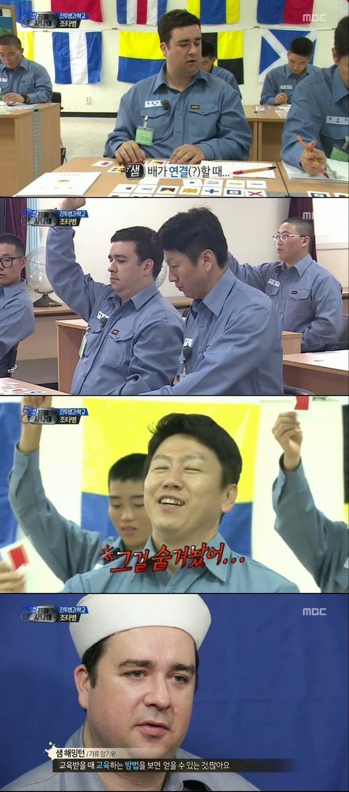 샘 해밍턴은 27일 오후 방송된 MBC 예능프로그램 '일밤-진짜사나이'(이하 '진짜사나이')에서 기류 신호에 대해 배우는 시간, 교관이 물어보는 모든 기류를 척척 알아 맞히며 놀라운 암기력을 보였다.