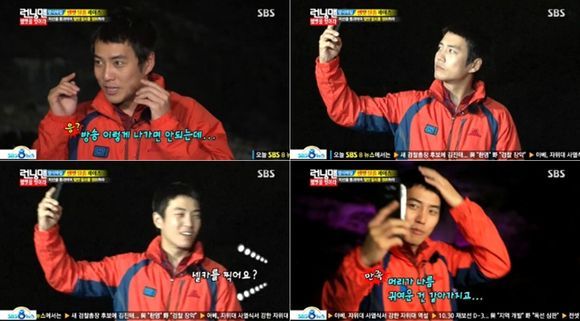 주상욱은 27일 방송된 SBS 예능 프로그램 '일요일이 좋다-런닝맨'에서 오랫동안 쓰고 있던 헬멧을 벗은 후 갑작스럽게 셀카를 찍어 출연진을 폭소케 했다.