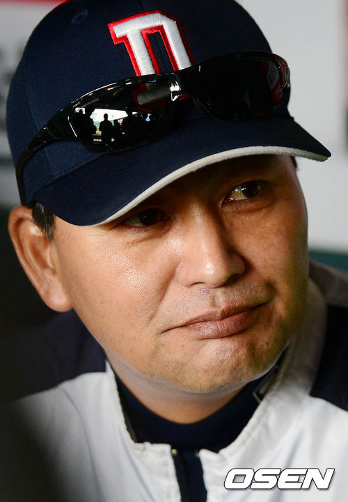 28일 오후 서울 잠실구장에서 열리는 '2013 한국야쿠르트 세븐 프로야구' 한국시리즈 4차전 두산 베어스와 삼성 라이온즈의 경기 시작전 김진욱 감독이 취재진들과 이야기를 나누고 있다.