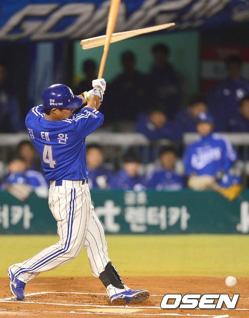28일 오후 서울 잠실구장에서 열린 '2013 한국야쿠르트 세븐 프로야구' 한국시리즈 4차전 두산 베어스와 삼성 라이온즈의 경기, 1회초 삼성 공격 1사 주자없는 상황 2번 김태완의 내야 땅볼 때 배트가 부러지고 있다.