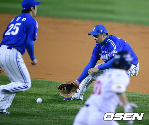 28일 오후 서울 잠실구장에서 열린 '2013 한국야쿠르트 세븐 프로야구' 한국시리즈 4차전 두산 베어스와 삼성 라이온즈의 경기, 1회말 1사에서 두산 정수빈이 기습번트 타구를 삼성 채태인이 잡아내고 있다. 정수빈은 헤드퍼스트슬라이딩으로 1루 세이프.