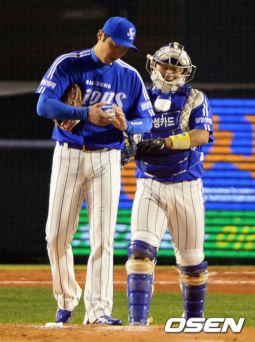 28일 오후 서울 잠실구장에서 열린 '2013 한국야쿠르트 세븐 프로야구' 한국시리즈 4차전 두산 베어스와 삼성 라이온즈의 경기 1회말 1사 1,2루 최준석 타석, 배영수와 이지영이 이야기를 나누고 있다.