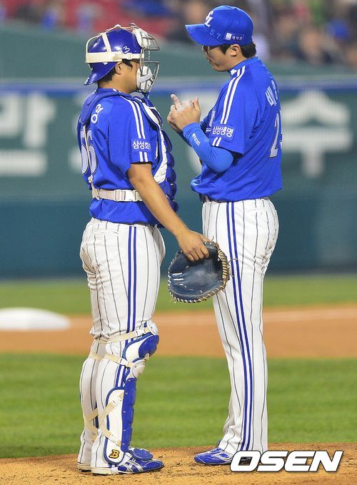 28일 오후 서울 잠실구장에서 열린 '2013 한국야쿠르트 세븐 프로야구' 한국시리즈 4차전 두산 베어스와 삼성 라이온즈의 경기, 1회말 두산 공격 1사 1, 2루 상황 삼성 선발 배영수와 포수 이지영이 대화를 나누고 있다.