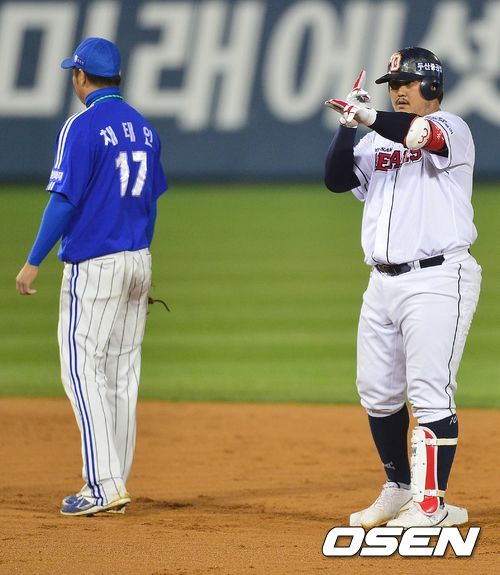28일 오후 서울 잠실구장에서 열린 '2013 한국야쿠르트 세븐 프로야구' 한국시리즈 4차전 두산 베어스와 삼성 라이온즈의 경기, 1회말 두산 공격 1사 1, 2루 상황 최준석이 좌익수를 넘기는 1타점 2루타를 날리고 2루에 안착해 환호하고 있다.