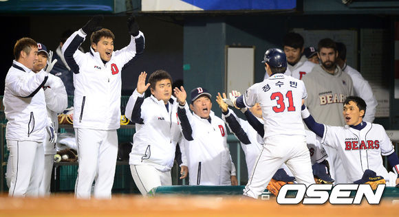 28일 오후 서울 잠실구장에서 열리는 '2013 한국야쿠르트 세븐 프로야구' 한국시리즈 4차전 두산 베어스와 삼성 라이온즈의 경기, 1회말 1사 1,2루 두산 최준석이 안타로 득점을 올린 정수빈이 동료드로가 기뻐하고 있다.