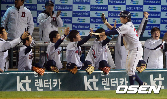 28일 오후 서울 잠실구장에서 열린 '2013 한국야쿠르트 세븐 프로야구' 한국시리즈 4차전 두산 베어스와 삼성 라이온즈의 경기 1회말 1사 1,2루 최준석의 1타점 2루타에 홈을 밟은 2루주자 정수빈이 덕아웃에서 동료들과 하이파이브를 하고 있다.