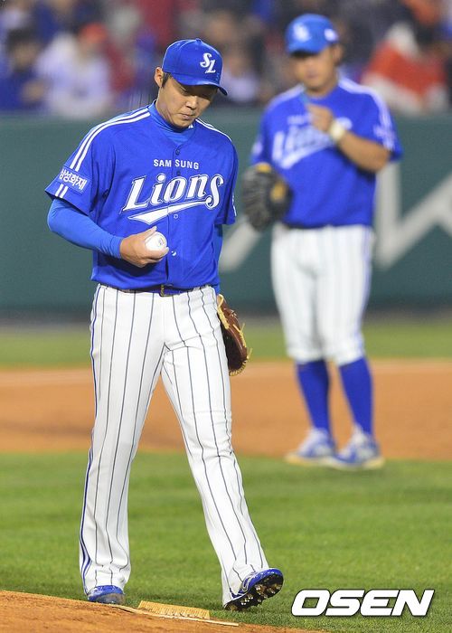 28일 오후 서울 잠실구장에서 열린 '2013 한국야쿠르트 세븐 프로야구' 한국시리즈 4차전 두산 베어스와 삼성 라이온즈의 경기, 1회말 두산 공격 1사 만루상황 양의지에게 중견수 희생플라이를 허용한 삼성 선발 배영수가 아쉬워하고 있다.
