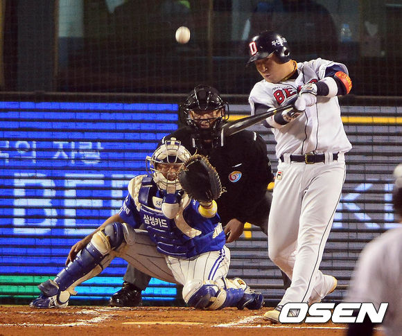 28일 오후 서울 잠실구장에서 열린 '2013 한국야쿠르트 세븐 프로야구' 한국시리즈 4차전 두산 베어스와 삼성 라이온즈의 경기 1회말 1사 만루 양의지가 희생플라이를 치고 있다.