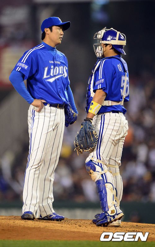 28일 오후 서울 잠실구장에서 열리는 '2013 한국야쿠르트 세븐 프로야구' 한국시리즈 4차전 두산 베어스와 삼성 라이온즈의 경기, 2회말 1사 1루 삼성 배영수와 이지영이 이야기를 나누고 있다.