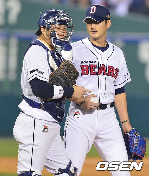28일 오후 서울 잠실구장에서 열린 '2013 한국야쿠르트 세븐 프로야구' 한국시리즈 4차전 두산 베어스와 삼성 라이온즈의 경기, 3회초 삼성 공격 2사 1루 상황 채태인 타석을 앞에 두고 두산 선발 이재우와 포수 양의지가 대화를 나누고 있다.