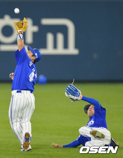 28일 오후 서울 잠실구장에서 열린 '2013 한국야쿠르트 세븐 프로야구' 한국시리즈 4차전 두산 베어스와 삼성 라이온즈의 경기, 4회말 삼성 공격 선두타자로 나선 양의지의 2루수 플라이 타구를 삼성 2루수 김태완고 중견수 배영섭이 겹치며 잡아내고 있다.