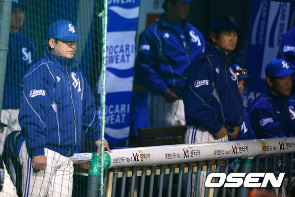 28일 오후 서울 잠실구장에서 열린 '2013 한국야쿠르트 세븐 프로야구' 한국시리즈 4차전 두산 베어스와 삼성 라이온즈의 경기, 6회초 삼성 류중일 감독이 더그아웃에서 경기를 지켜보고 있다.