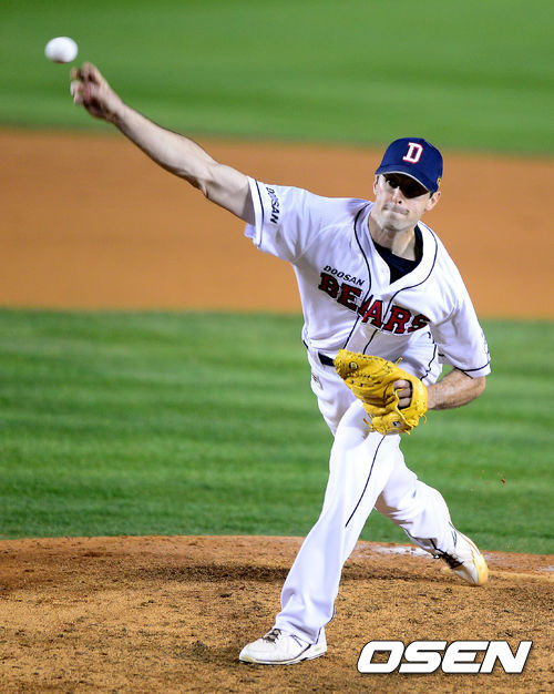 28일 오후 서울 잠실구장에서 열린 '2013 한국야쿠르트 세븐 프로야구' 한국시리즈 4차전 두산 베어스와 삼성 라이온즈의 경기, 6회초 두산 선발 이재우에 이어 핸킨스가 마운드에 올라 역투하고 있다.