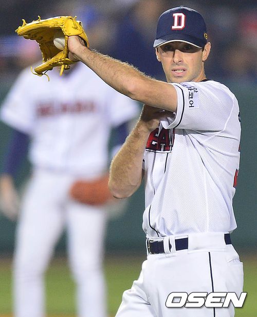 28일 오후 서울 잠실구장에서 열린 '2013 한국야쿠르트 세븐 프로야구' 한국시리즈 4차전 두산 베어스와 삼성 라이온즈의 경기, 6회초 삼성 공격 1사 주자없는 상황 최형우를 삼진으로 잡아낸 두산 투수 핸킨스가 포수에게 공을 넘겨받고 있다.