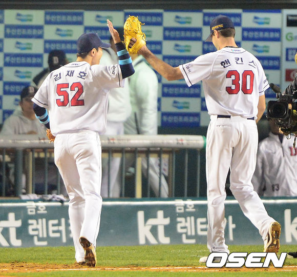 28일 오후 서울 잠실구장에서 열린 '2013 한국야쿠르트 세븐 프로야구' 한국시리즈 4차전 두산 베어스와 삼성 라이온즈의 경기 7회초 2사 1루 핸킨스가 진갑용을 삼진으로 처리하고 김재호와 하이파이브를 하고 있다.