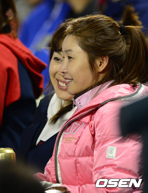 28일 오후 서울 잠실구장에서 열린 '2013 한국야쿠르트 세븐 프로야구' 한국시리즈 4차전 두산 베어스와 삼성 라이온즈의 경기, 두산 홍성흔의 아내 김정임씨와 삼성 진갑용의 아내 손미영씨가 나란히 앉아 경기를 관전하고 있다.