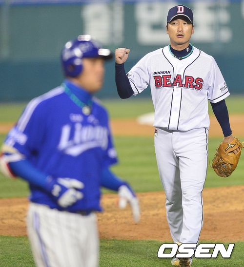 OSEN=잠실, 최규한 기자] 28일 오후 서울 잠실구장에서 열린 '2013 한국야쿠르트 세븐 프로야구' 한국시리즈 4차전 두산 베어스와 삼성 라이온즈의 경기, 8회초 삼성 공격 2사 주자없는 상황 채태인을 내야플라이로 잡아낸 두산 투수 정재훈이 주먹을 불끈 쥐고 있다.