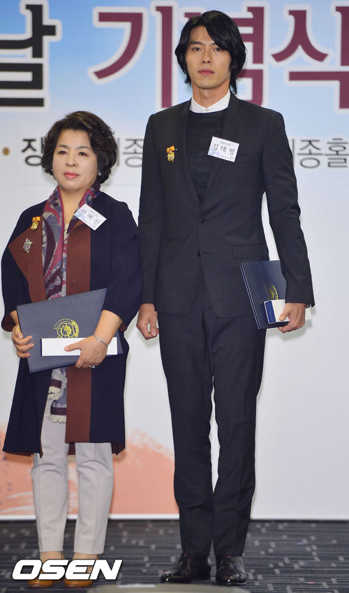 29일 오전 서울 세종문화회관 세종홀에서 열린 제 50회 저축의 날 기념식에 현빈이 대통령 표창을 수상한 후 대리 수상한 한혜진의 어머니와 함께 포토타임을 갖고 있다.