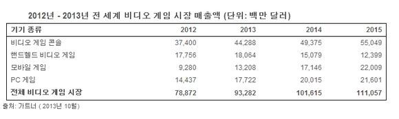 컨설팅 기관인 가트너(Gartner)는 29일 비디오 게임 콘솔 하드웨어와 소프트웨어, 온라인, 모바일과 PC 게임을 모두 포함하는 전세계 비디오 게임 시장이 2012년 790억 달러(83조7716억 원)의 규모에서 2013년에는 930억 달러(98조 6172억 원)의 규모로 성장할 것이라고 밝혔다.