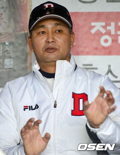 29일 오후 서울 잠실구장에서 열리는 '2013 한국야쿠르트 세븐 프로야구' 한국시리즈 5차전 두산 베어스와 삼성 라이온즈의 경기, 두산 김진욱 감독이 취재진과 대화를 나누고 있다.