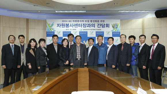2014 인천아시아경기대회조직위원회(위원장 김영수)는 29일 조직위원회에서 인천시·군·구 자원봉사센터장과 인천지역 12개 대학 학생회장단을 잇따라 초청해 자원봉사자 모집 활성화를 위한 간담회를 열었다.