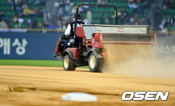 29일 오후 서울 잠실구장에서 열리는 '2013 한국야쿠르트 세븐 프로야구' 한국시리즈 5차전 두산 베어스와 삼성 라이온즈의 경기, 소나기로 인해 젖은 그라운드에 관계자들이 흙을 뿌리고 있다.